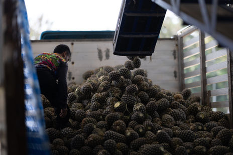From plowing the soil and planting neat rows of young pineapple shoots to watering, pruning, fertilizing, and finally plucking and cleaning each fruit, Pa Rom and farmers like her are intimately involved in every stage. The care is so meticulous that when young fruit emerges, they wrap hundreds of pineapples in handmade nests of twigs or newspaper to shield them from the sun. Understandably, any damage to this investment, of both effort and money, brings deep frustration and loss.